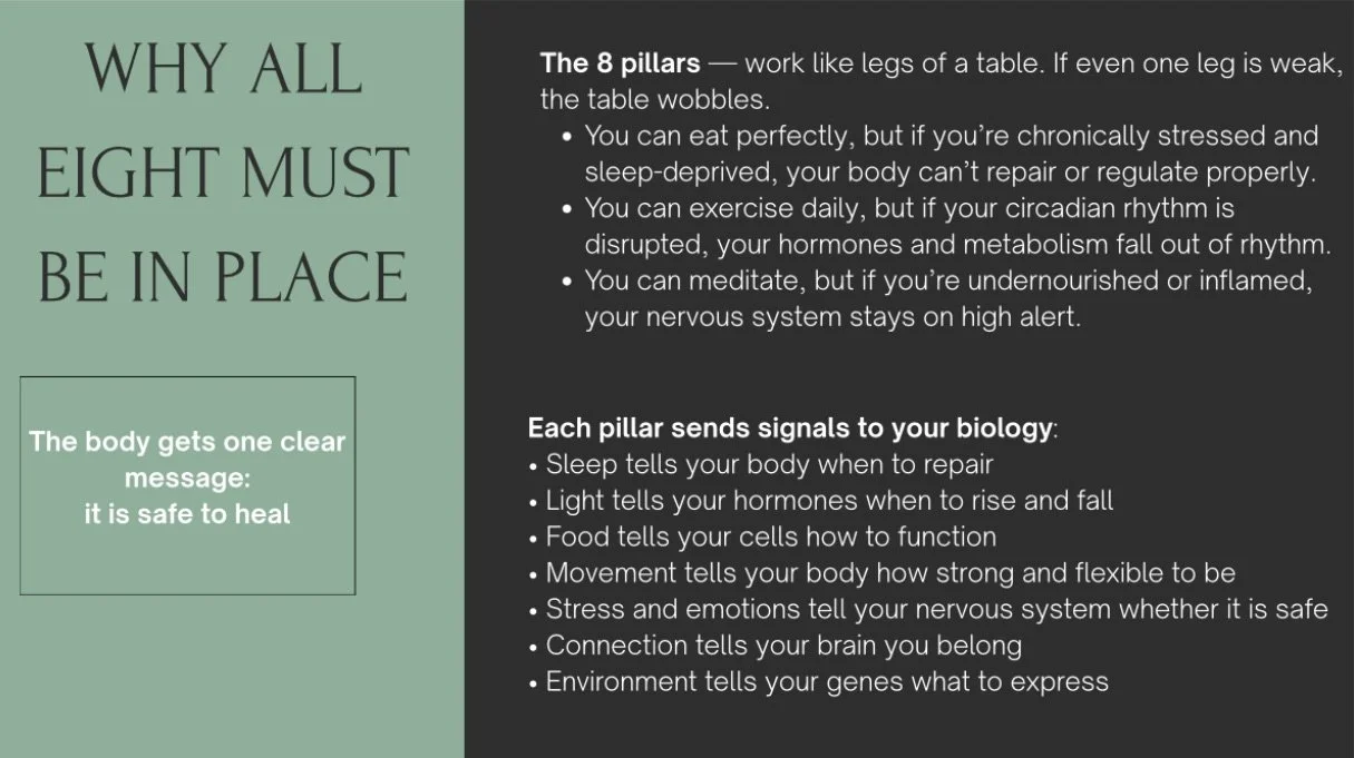 Functional Medicine Health Coaching is a personalized and holistic approach to improving your overall health and well being. We look at the root cause of health issues focusing on you as a whole. Together, we may explore the eight pillars of lifestyle contributing to YOUR health; stress, sleep, circadian rhythm, nutrition, movement, social connection, purpose & meaning and mental & emotional health. I help educate, encourage and empower you towards the changes you want to make to be able to live your best life.